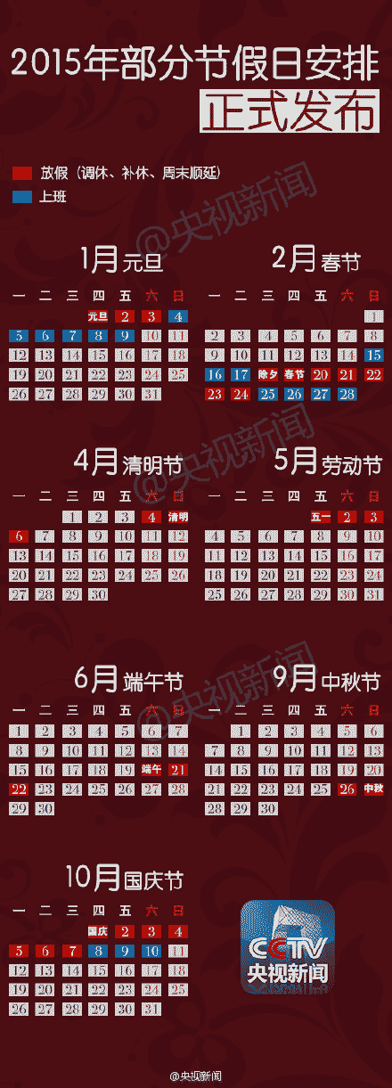 經(jīng)國(guó)務(wù)院批準(zhǔn),現(xiàn)將2015年元旦、春節(jié)、清明節(jié)、勞動(dòng)節(jié)、端午節(jié)、中秋節(jié)和國(guó)慶節(jié)放假調(diào)休日期的具體安排通知如下。