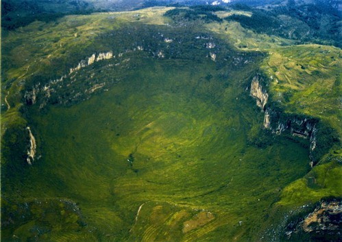 六盤水花嘎天坑位于水城縣花嘎鄉(xiāng)東北3公里,該溶斗為發(fā)育于中上石炭紀(jì)碳酸巖鹽中,呈橢圓形,該溶斗深200——300米,頂部長(zhǎng)軸直徑700米,底部長(zhǎng)軸直徑250米,其南側(cè)約2公里處為北盤江支流深切700米的烏都河峽谷。