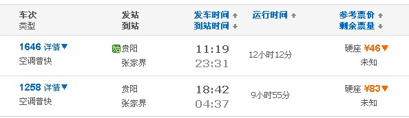 貴陽到張家界的列車有:1646次和1258次空調(diào)普快。