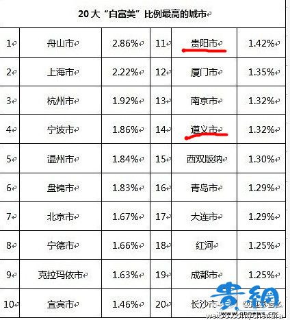 網(wǎng)傳的。全國20大白富美比例最高城市,貴陽榜上有名!
