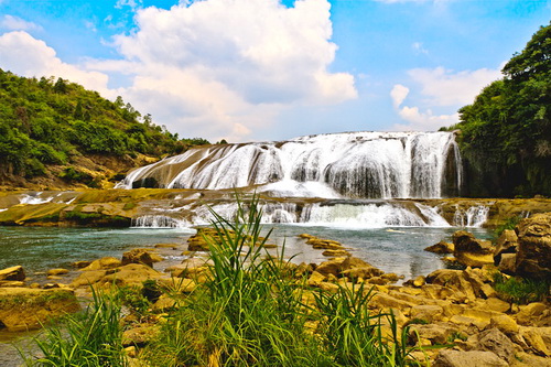 陡坡塘瀑布位于貴州省黃果樹瀑布上游1公里處,瀑頂寬105米,高21米,是黃果樹瀑布群中瀑頂最寬的瀑布。陡坡塘瀑布頂上是一個(gè)面積達(dá)1.5萬(wàn)平方的巨大溶潭,瀑布則是形成在逶迤100多米長(zhǎng)的鈣化灘壩上。陡坡塘瀑布還有一個(gè)特殊的現(xiàn)象:每當(dāng)洪水到來(lái)之前,瀑布都要發(fā)出“轟隆。轟隆”的吼聲,因此又叫“吼瀑”。