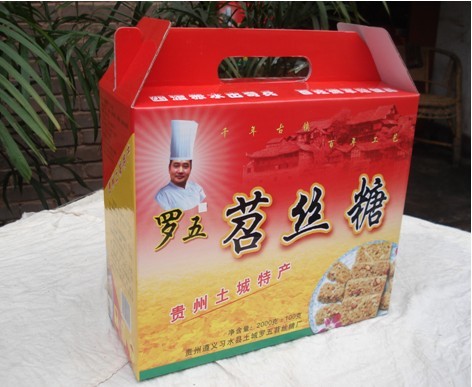 羅五苕絲糖系家傳祖業(yè),已有百年歷史。它取用本地優(yōu)質(zhì)糯米、紅心苕、白砂糖、飴糖、花生、芝麻、核桃等綠色食品原料。承羅氏百年祖?zhèn)鞴に嚕?jīng)蒸、煮、煎、搓、揉、壓等三十六道工序精制而成。具有酥脆爽口,香甜不膩,營養(yǎng)豐富,是一種老少皆宜的綠色健康食品,宴慶饋贈(zèng)佳品。這款綠色的包裝盒主要表現(xiàn)這樣的產(chǎn)品特性,其一百年工藝,傳統(tǒng)特色,其二用料考究地道,原料綠色自然。紅黃交漸的花邊,土城老宅底紋式的鋪墊,苕絲糖本色的照片,加上中式傳統(tǒng)祥紋,將百年名品表現(xiàn)得淋漓盡致,深綠色搭配,凝重而又不失和諧,寓意出產(chǎn)品的原料綠色天然,口味自成一絕。整個(gè)包裝簡(jiǎn)潔明快,色調(diào)搭配合理,充分展現(xiàn)了一個(gè)百年傳統(tǒng)名小吃的特色。